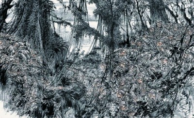 此外,还有的艺术家通过对笔触的个性化处理,赋予作品独特的情感表达。任惠中的中国画《中国远征军》(图⑤)再现了中国军人在缅北滇西战场上与日军血战的壮烈场景。创作中,画家通过粗粝的皴擦之法模拟热带雨林的潮湿瘴气,树皮肌理、士兵衣褶的刻画如刀削斧劈,甚至人物的面部也以干笔焦墨刻画。风格强烈的笔触运用,恰如其分地展现出战争的惨烈与悲壮,亦是对远征军战士们坚毅不屈精神的礼赞。