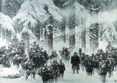 与前者的激昂色调相较,黄洪涛的中国画《东北抗日联军》(图④)则以冷峻的灰色调彰显出英雄队伍的精神品格。白茫茫的背景中,被积雪压弯的树枝在呼啸的狂风中若隐若现,传递出压抑、肃杀的氛围,借此体现战士们所处自然环境的恶劣以及斗争环境的残酷。前景中,以重色塑造的战士们的身躯犹如一座座巍然矗立的铁塔,与漫天飞雪的凛冽形成无声对峙,生动展现出他们用生命和热血捍卫祖国尊严的信念与决心。