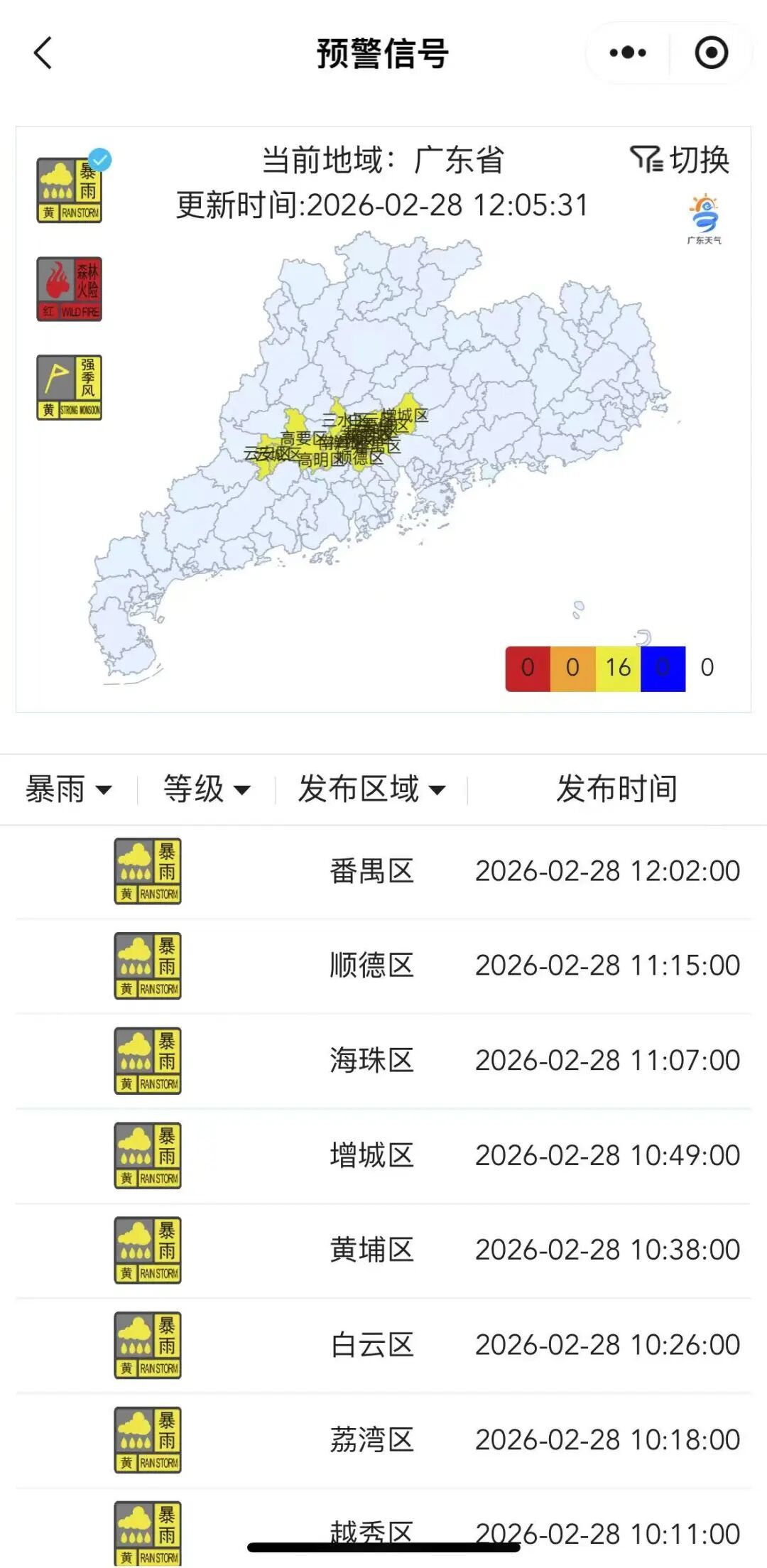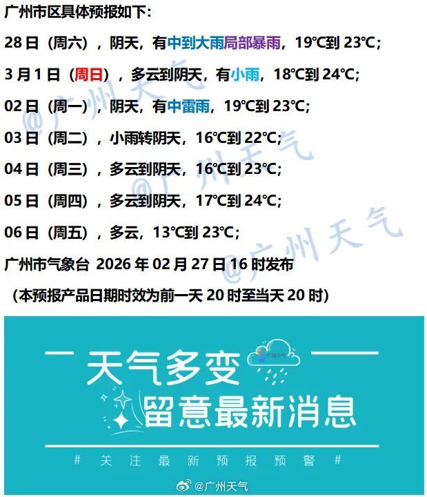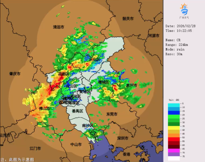 另据@广东天气,预计2月28日,粤北、珠三角中北部有中到大雨局部暴雨,部分市县伴有弱雷电、短时强降水和6-8级短时大风,最大时雨量20~30毫米,其余市县阴天有小雨。