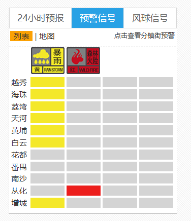 从28日10时11分起,广州市越秀区、天河区暴雨黄色预警信号生效,后期升级预警信号的可能性较小,请注意做好防御工作。